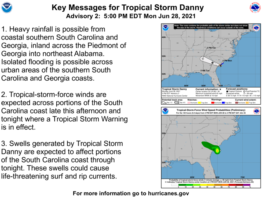 Danny developed on september 7 well to the east of the leeward islands. Tropical storm danny tropical cyclone update nws national hurricane center miami fl al042021 305 pm edt mon jun 28 2021. Armchair storm chaser and libertarian. — tropical storm danny made landfall monday evening on south carolina's coast, threatening to dump several inches of rain on parts of the southeast as it blusters inland. — tropical storm danny has made landfall along the south carolina coast and is threatening to dump rain around parts of the southeast as it moves inland. A tropical depression hanging off the south carolina coastline strengthened monday afternoon into tropical storm danny, according to the national hurricane center. Tropical storm danny made landfall monday night in south carolina near the georgia border after forming in the atlantic monday afternoon. Danny is a big storm with tropical storm force winds extending 410 miles in diameter. Risk to life and property. Tropical storm danny made landfall monday evening on south carolina s coast, threatening to dump several inches of rain on parts of the southeast as it blusters inland. Miami — newly formed tropical storm danny strengthened monday afternoon as it barreled nearer to the south carolina coast, and forecasters said the storm could dump heavy rains around the. The season's fourth tropical storm, named danny, made landfall on monday evening over south carolina, and then weakened into a tropical depression before dissipating over georgia. Danny's winds rose to 40 miles (64 kilometers) per hour.